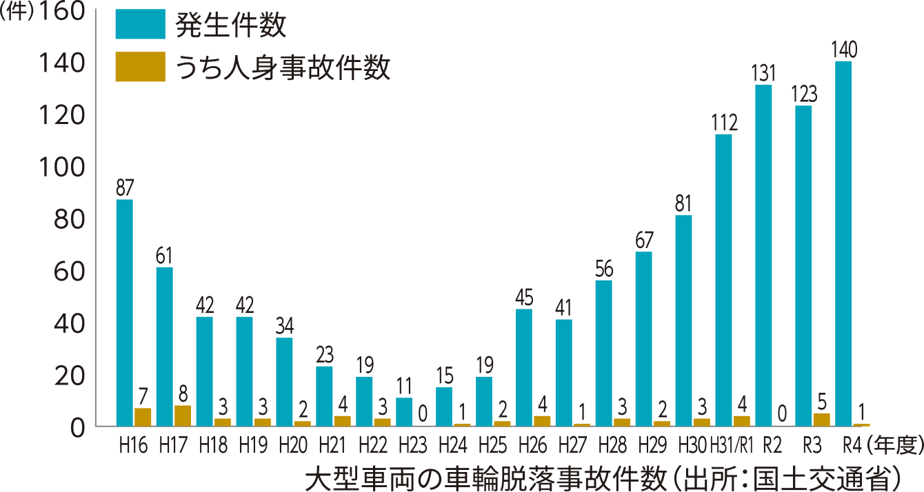 2010年台前半のホイール規格変更を機に、車輪脱落事故件数が増加。