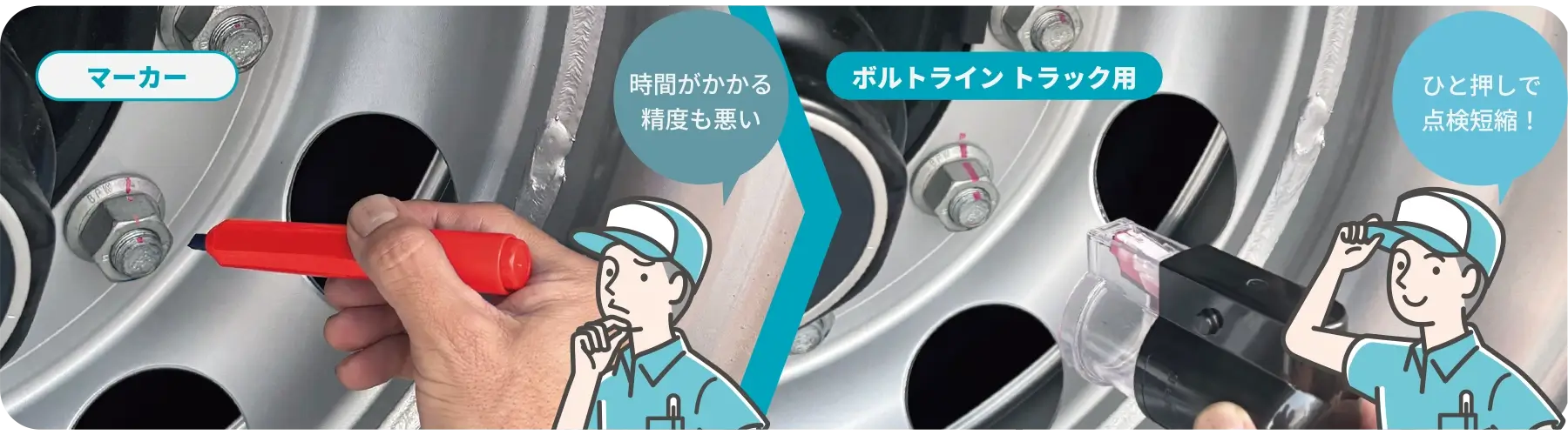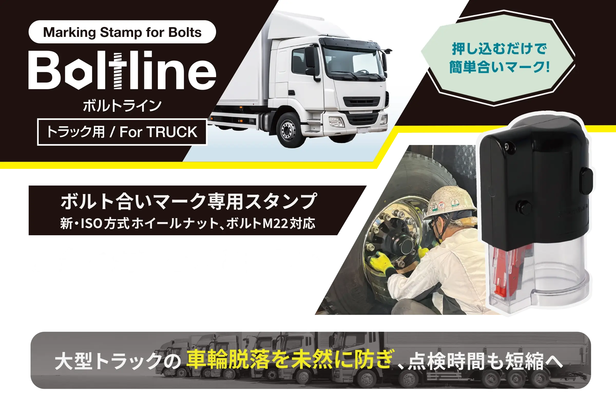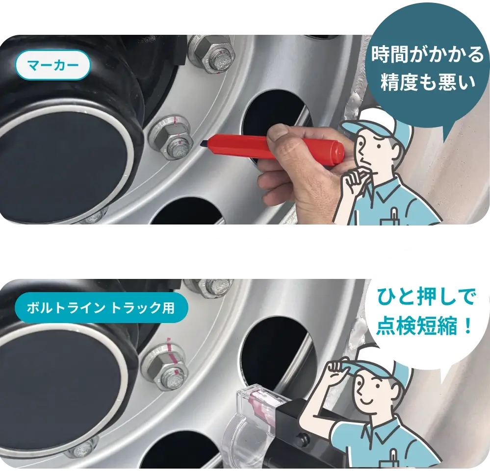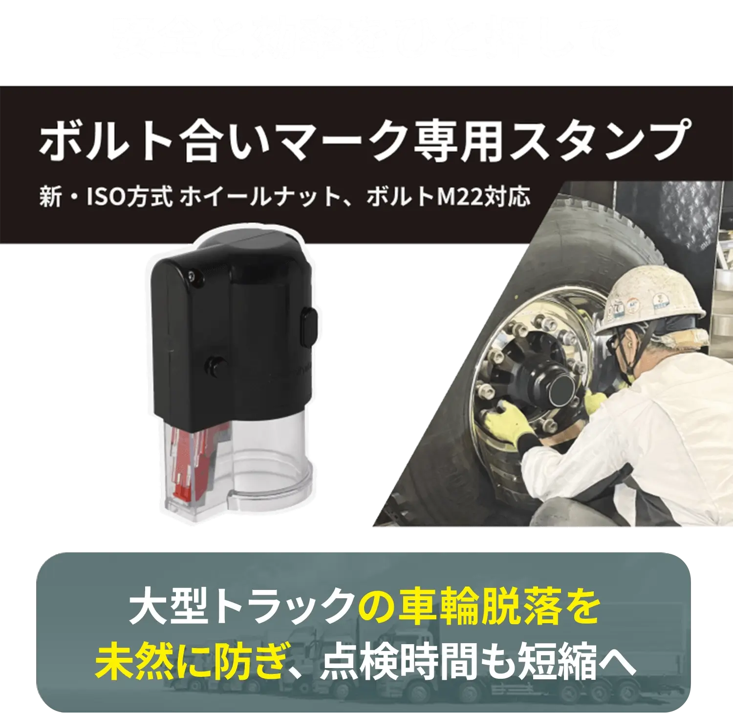 大型トラックのタイヤ固定ボルト点検に 欠かせない合いマークスタンプだから誰でも 素早く、正確に、安全管理 できます。